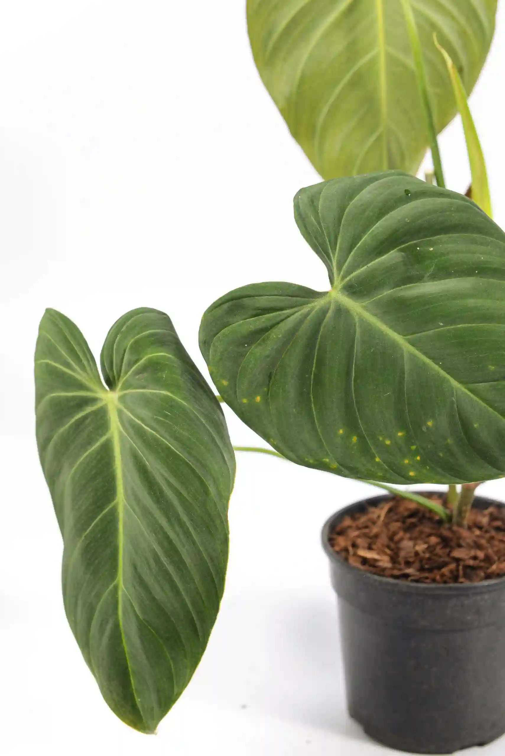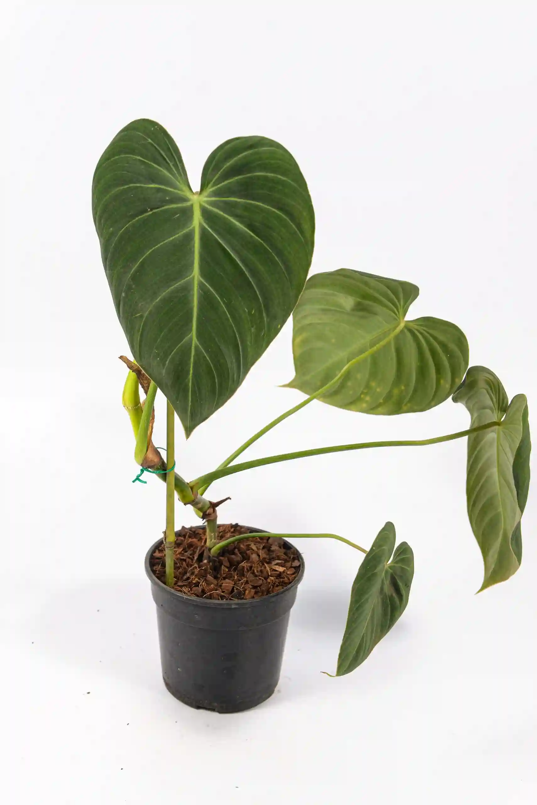 Philodendron Glorious in a pot with velvety green leaves and pale veins.